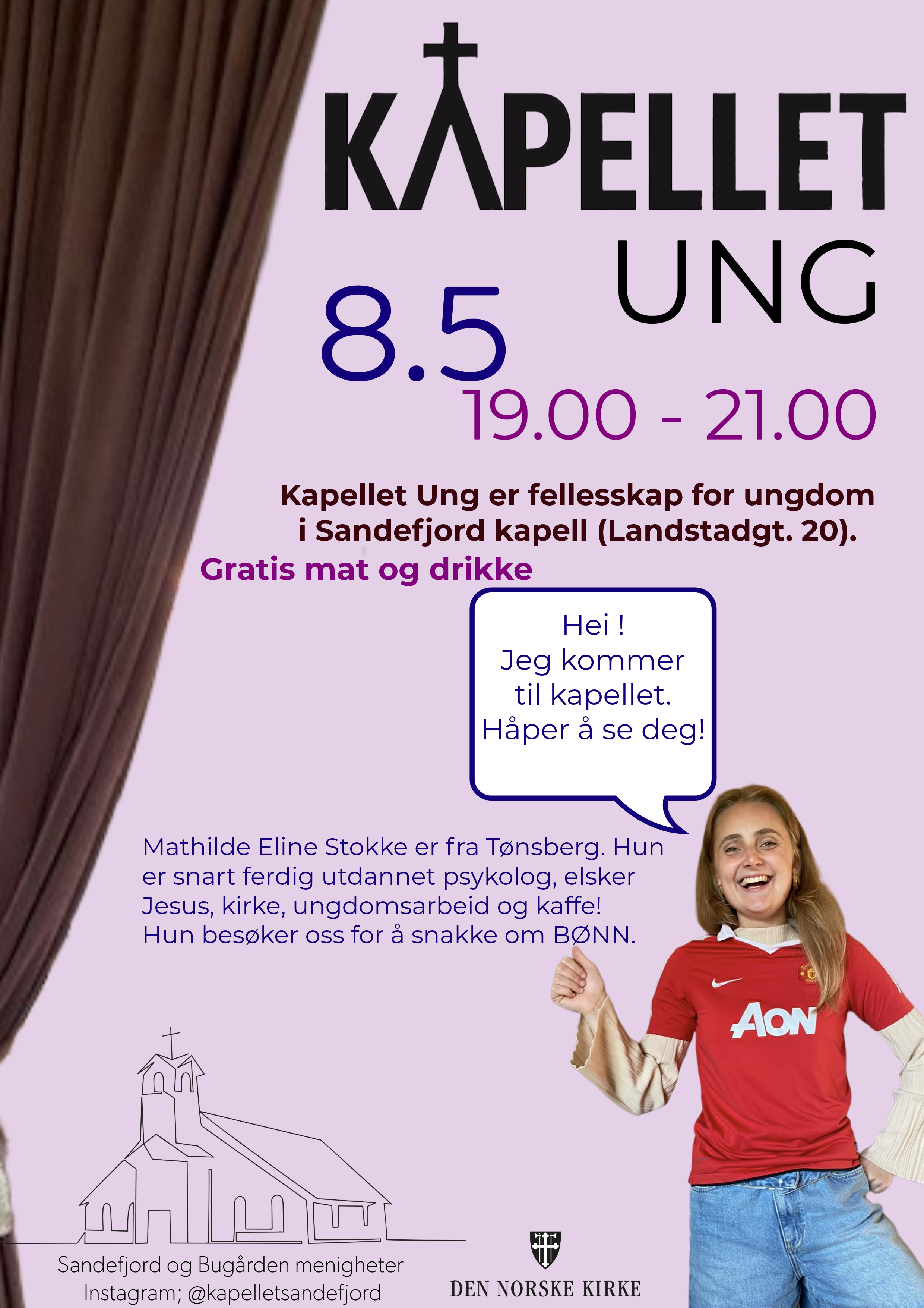 Fredag 8.5 får vi besøk av Mathilde Eline Stokke som er født og oppvokst i Tønsberg. Hun bor i Oslo, og er snart ferdig utdannet psykolog. Hennes engasjement for ungdom og menighet er smittende, og hun har talt på store festivaler som Skjærgårds M&M og Ge...