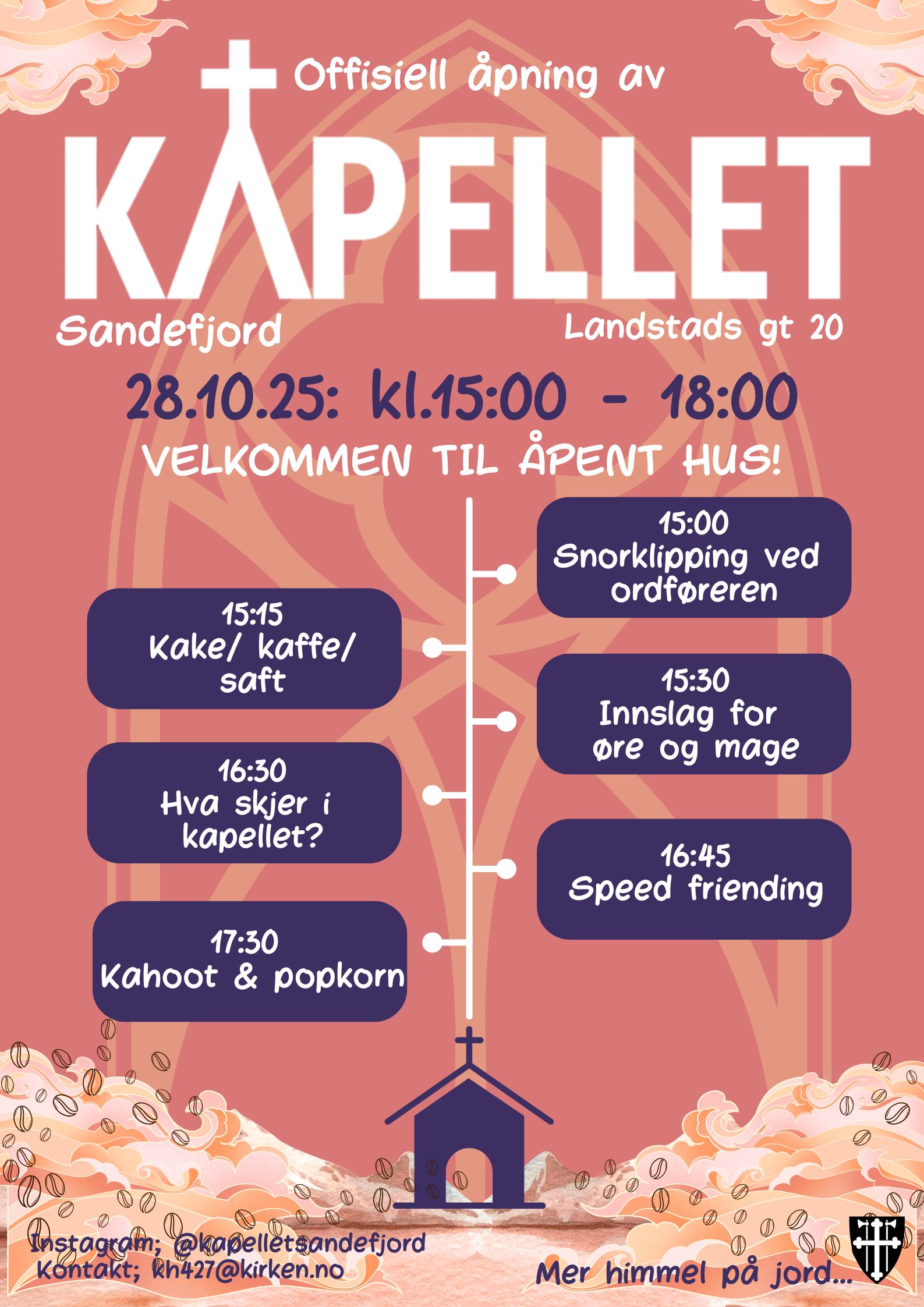 Sandefjord kapell står straks klar for åpningsfest den 28.10. Det blir en åpen dag, hvor man kan komme og gå som det passer fra kl.15-18. Programmet er variert, og det blir både taler, musikk, snorklipping og bevertning. Vi håper på en "rullering", og at så mange som mulig får mulighet til å titte innom.