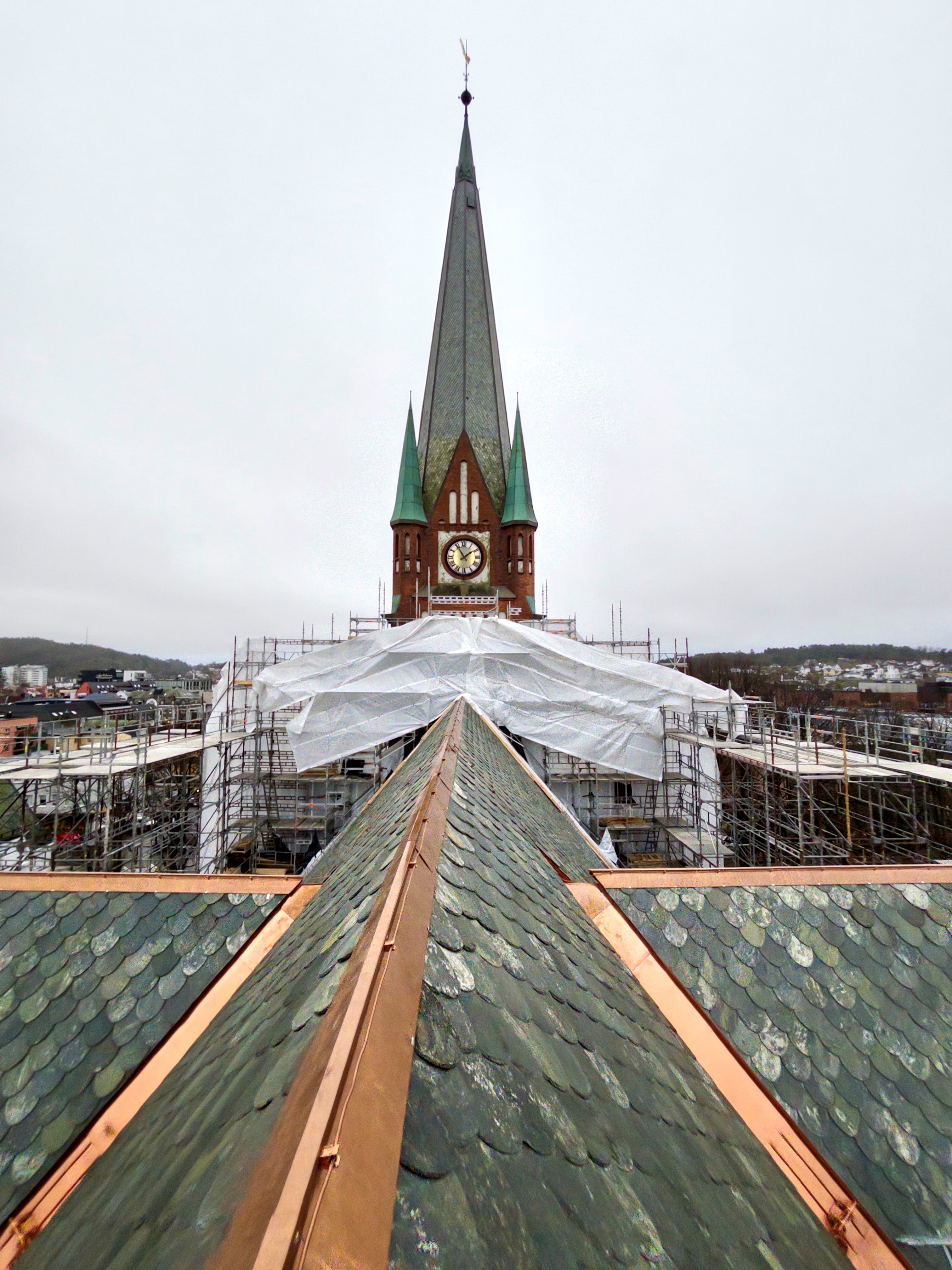 Arbeidet med å restaurere taket på Sandefjord kirke har kommet langt. Prosjektet skal være ferdig i starten av mai.