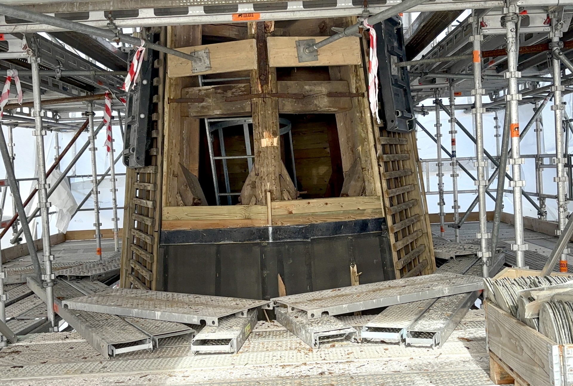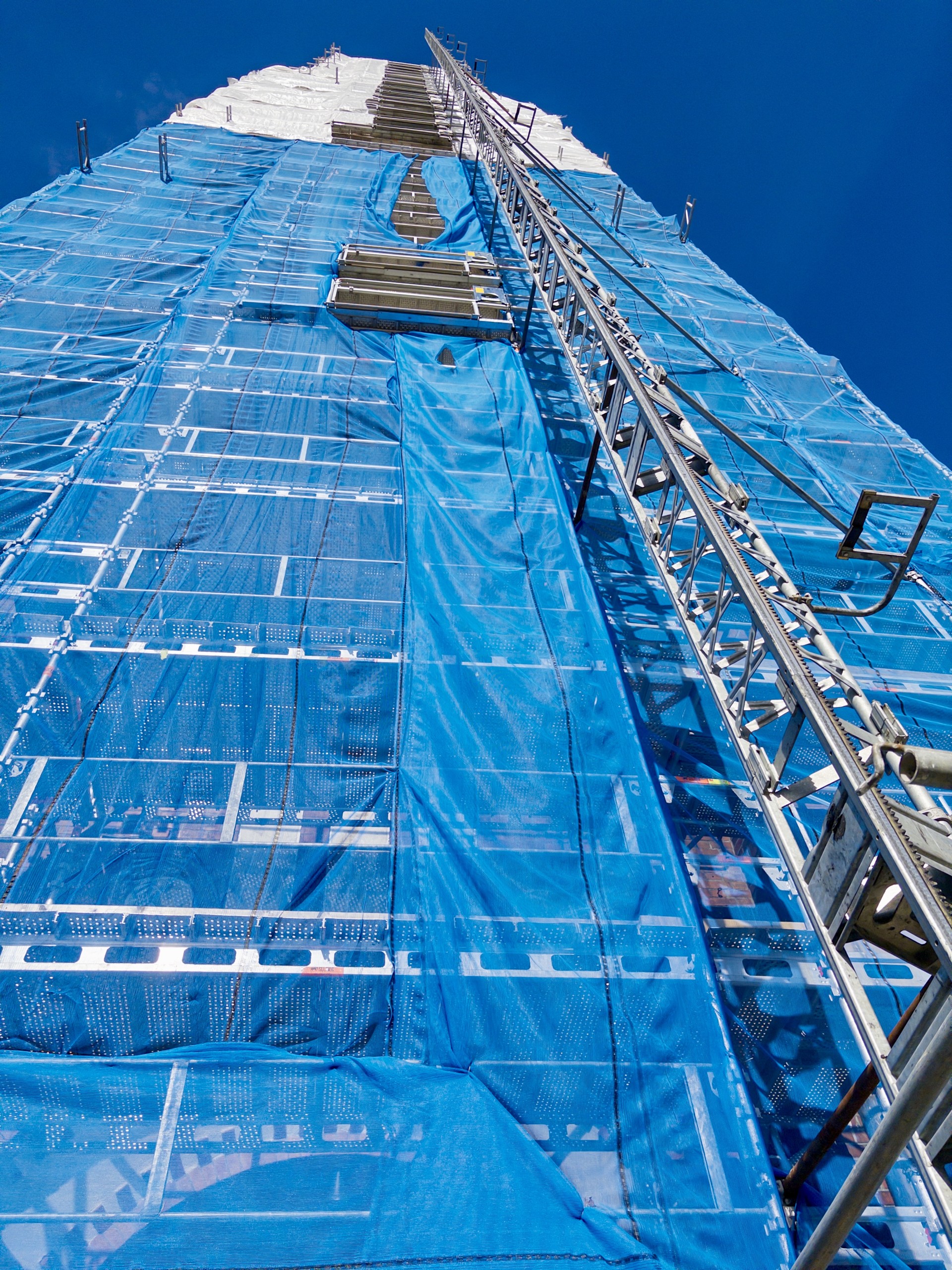 60 meter over bakker rager tårnet på Sandefjord kirke. Stillaset rager enda noen meter opp og fra utsiden kan det for øyeblikket minne mer om en skyskraper enn et kirketårn. Vi var heldige som fikk muligheten til å se restaureringsarbeidet på nært hold og ikke minst nyte den storslåtte utsikten over byen og fjorden.