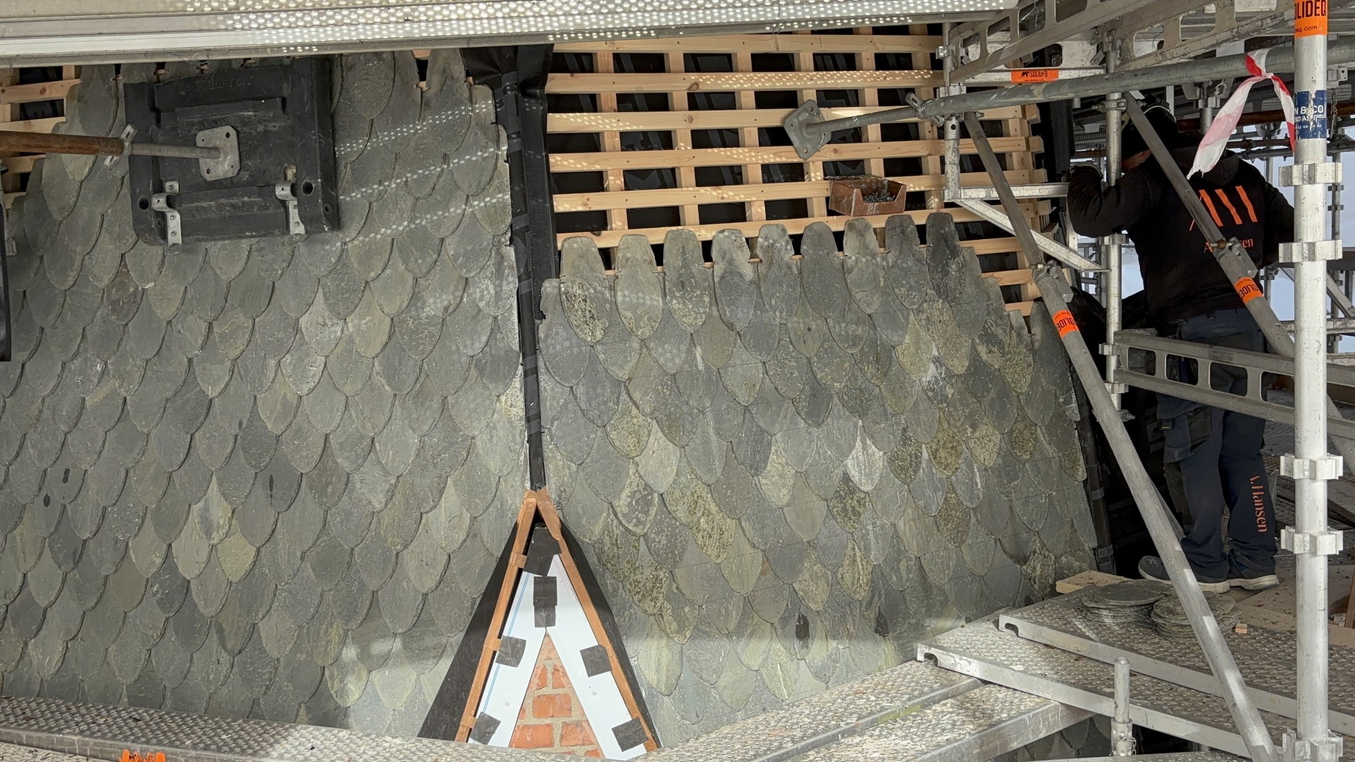 Spiret utgjør 20 meter med trekonstruksjoner innvendig og skifer på utsiden. Håndtverkerne har åtte meter igjen før spiret er ferdigstilt. Værhanen som skal pryde toppen av spiret er for tiden inne i Oslo for å bli forgylt på nytt.