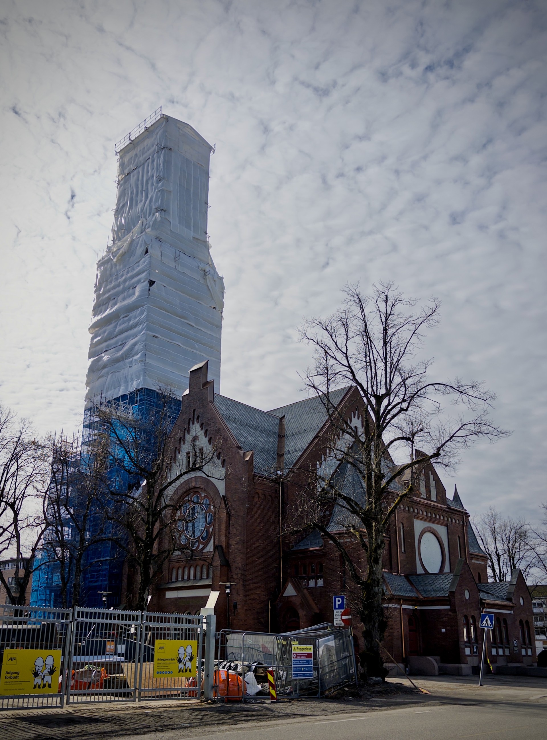 Flere lurer på om ikke de lyse feltene på veggene av kirken burde males. Det skal de! Det var bare for kaldt i vinter mens stillasene var oppe. Når været tillater det blir det malt ved hjelp av lift.
