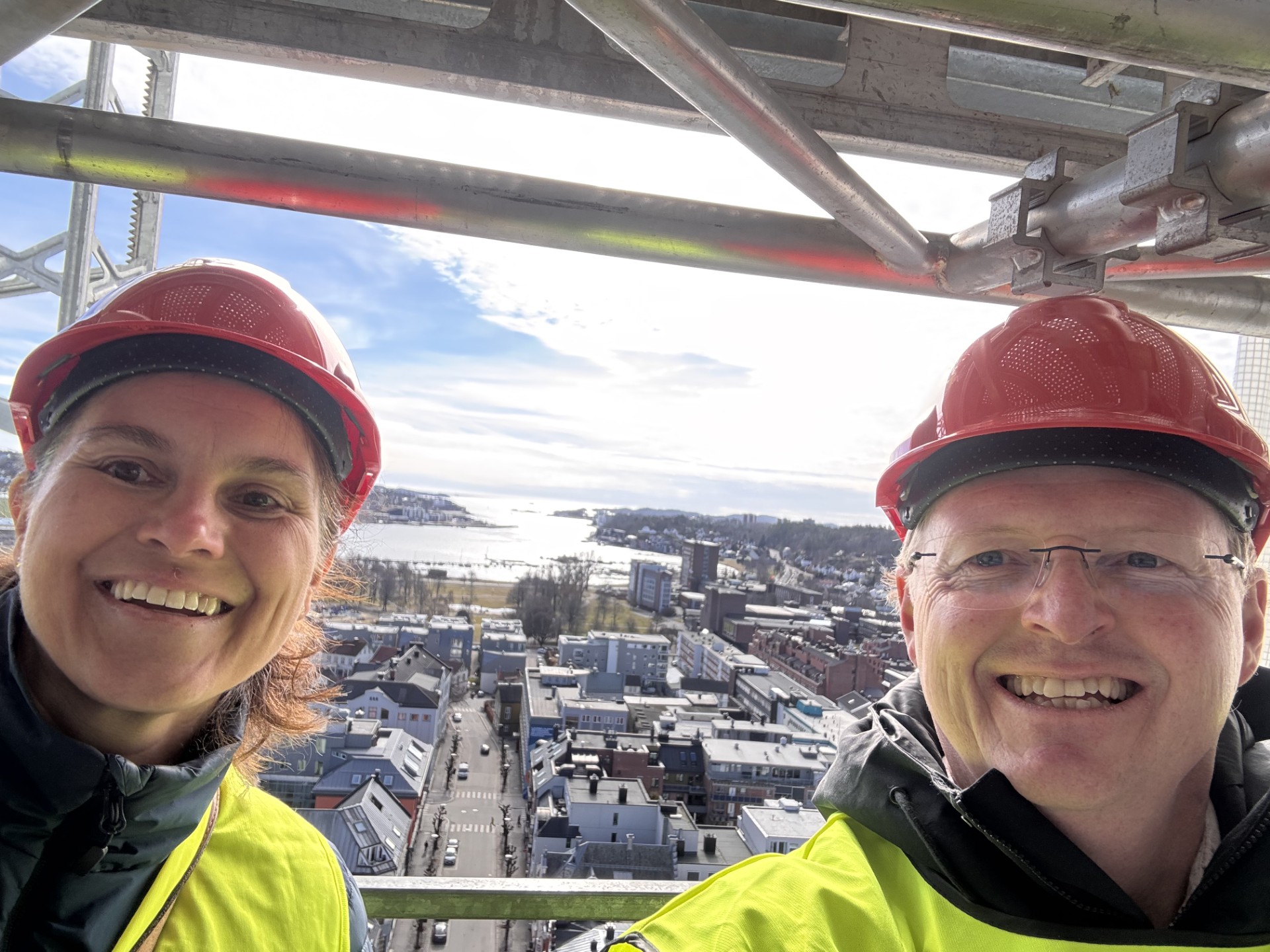 Tone Bergene Aabrekk (menighetsrådsleder) og Tore Hummelvoll (sokneprest) var glade for muligheten til å inspisere arbeidet og se utsikten.